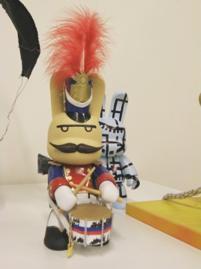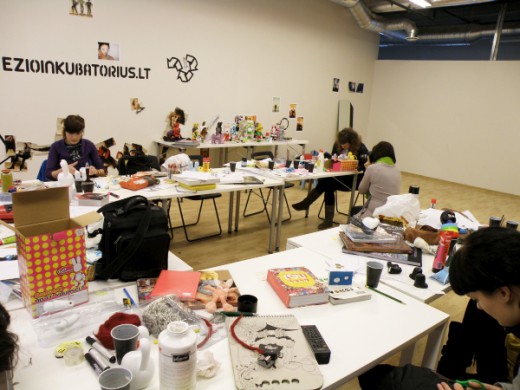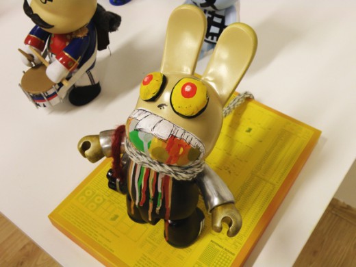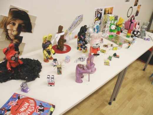 Na, o šį kartą – piešimas. Workshopą veda dvi mergaitės iš MOYTOY. Pagrindinė užduotis – iš balto vinilinio kiškio sukurti charakterį (kai kurie, darbštesni, sugalvoja savo personažams ir visą CV). Bet čia, kaip sakoma, pati ledkalnio viršūnė, dar laukia daug visokių mini-užduočių.