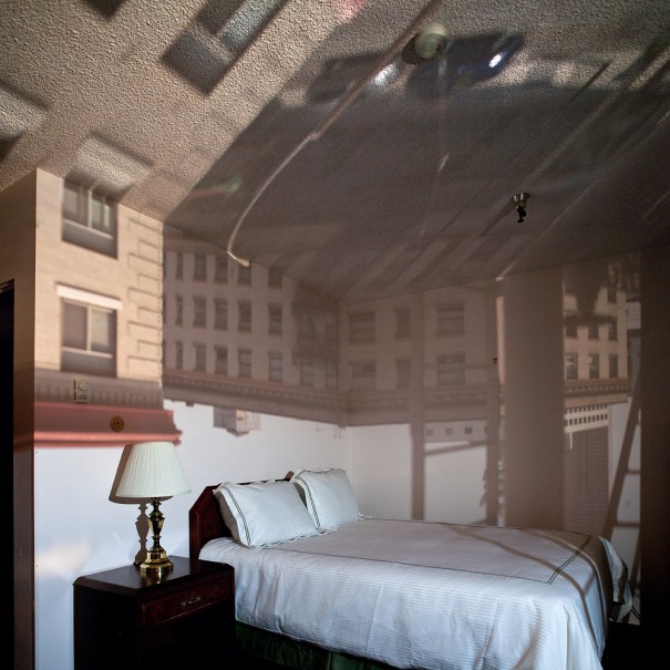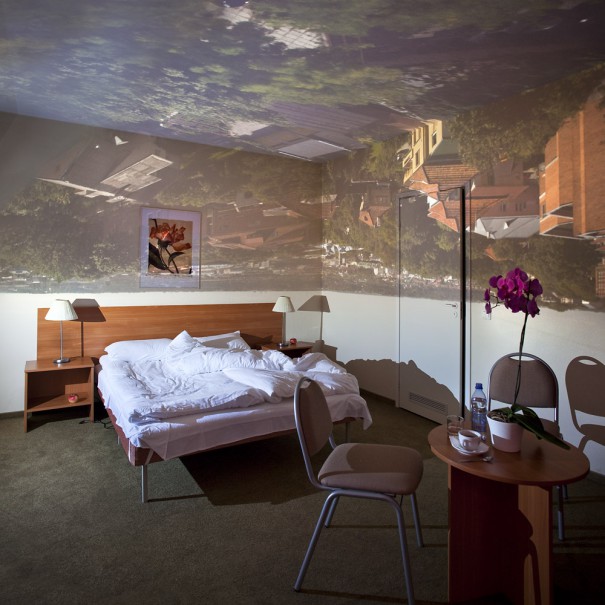 Viešbučio kambariai – universaliai neutrali teritorija, laikinas vienišo keliauninko prieglobstis, į kurį projektuojamas gyvas realaus miesto audinys. Aklinai užtemdytuose languose paliekama nedidelė apvali skylutė, pro kurią į vidų veržliai skverbiasi šviesa ir ant sienų piešia išvirkštinį urbanistinį motyvą. Esame mieste neišėję iš kambario, ir bandome atlaikyti nepažįstamo miesto „svorį“. O kita kartą kyla toks jausmas lyg tai butu praėjusios dienos įspūdžiai mūsų pasąmonės dienoraštyje, kurie kantriai ir tvarkingai laukia musu interpretacijos.