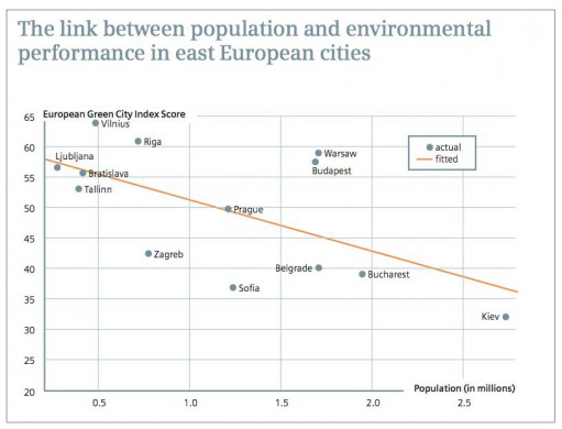 Kita netikėta tendencija – miestų populiacijos dydis ir ekologija. Kaip rodo antrasis „European Green City Index“ pateikiamas grafikas, egzistuoja neigiama priklausomybė tarp šių dviejų dydžių – kuo daugiau gyventojų mieste, tuo mažiau jis ekologiškas. Tiesa, grafike nepateikti Skandinavijos ir Vakarų Europos miestai, kuriuose gyventojų skaičius (lyginant su Rytų Europos miestais) yra didelis, tačiau kartu jie yra ir gana aukštai reitingo lentelėje.