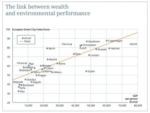 Kadangi buvo tirta trisdešimt miestų iš įvairių Europos šalių, galima palyginti skirtingų kapitalizmo modelių įtaką miestų ekologijai. Nors akivaizdžiausia priklausomybė matoma tarp mieste sukuriamo BVP vienam gyventojui ir miesto balų taškų. Tyrėjai tai aiškina turtingesnių miestų polinkiu daugiau lėšų skirti ekologinėms programoms, kurios padeda mažinti taršą. Tuo tarpu ne tokie turtingi miestai turimas lėšas panaudoja kitur, tarkime socialinės atskirties mažinimui.