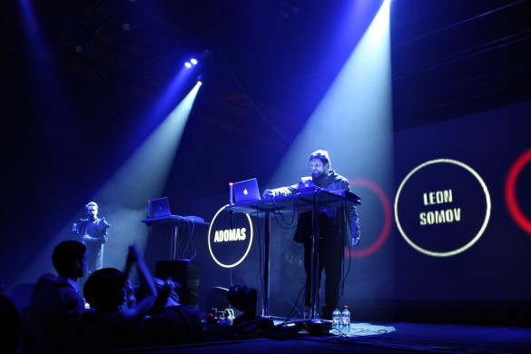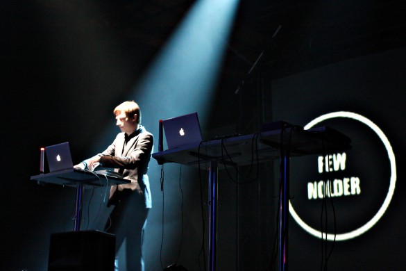 Taigi, renginys prasidėjo valanda vėliau ir tikriausiai nuo visus išvarginusio laukimo nukentėjo koncerto pradžia: ištęstų muzikinių kompozicijų klausytis gana sudėtinga, o ir šokti pagal jas nelabai išeitų, tačiau publika pamažu atgijo. Scenoje, prie iš toli švytinčių „Apple“ kompiuterių pasirodė Few Nolder. Įsibėgėjant muzikinėm improvizacijoms prisijungė Leon Somov, Vidis ir Mario Basanov, grodami tai po vieną, tai poromis, tačiau viską apjungdami į darnią, nenutrūkstančią garsų kompoziciją. Elektroninį skambesį papildė scenos šonuose įsikūrę muzikantų orkestrai, pritariantys pačiais įvairiausiais muzikos instrumentais, pradedant būgnais, baigiant kanklėmis ir fleita. Klausytojai galėjo ir girdėti ir matyti žadėtuosius netradicinius instrumentuotės junginius, tačiau garsais improvizuojantys DJ turbūt užmiršo, jog kurti atmosferą padeda ne tik muzika, bet ir kūno plastika: Mario Basanov ir Vidis stovėjo prie pultų tarsi prikalti, o jiems antrinantys orkestro muzikantai rodės tuoj užmigs! Few Nolder stengėsi išlikti santūrus, o vienintelis Leon Somov atsidavė muzikai ir ritmingai judėjo į taktą, kartkartėmis nusišypsodamas. Kadangi scena ir žiūrovai yra pastatomi „face to face“, natūralu jog žvilgsnis fokusuojamas į atlikėjus, bet pastarieji matyt apie tai nepagalvojo.