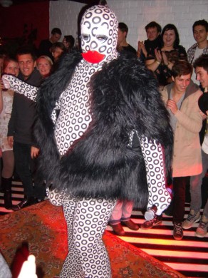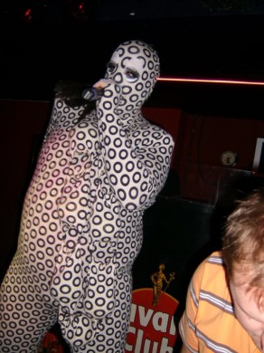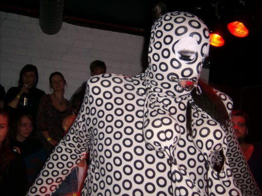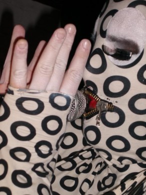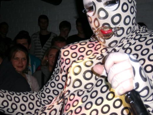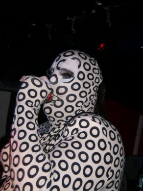 Nusprendžiau pasirodyti su visą kūną dengiančiu sceniniu kostiumu su užtrauktuku lūpų zonoje. Ratukai simbolizuoja daug ką (ekstazė, lyčių simboliai, balls, angos, orgazmas, onanizmas, orgija, oralinis, dūmai). Šitas kostiumas dabar mano feivorit, nes jis ne tox vulgarus kaip šitas arba šitas, be to, jis tox JAUKUS, primena pižamą, namų židinį ir t.t.