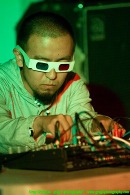 Pagaliau prie muzikinės aparatūros salė išvydo svečią iš Japonijos, architektą Kouhei Matsunaga. Vos jam prisilietus prie technikos, Piano.lt salę užplūdo įmantriai interpretuojami lauko varpeliai bei šūsnis rimtai nusiteikusių žemų dažnių garsų. Viso pasirodymo metu galima buvo stebėti vizualizaciją, kuri priminė baltą voratinklį iš kintančių smaragdų formos figūrų juodame fone. Po kurio laiko eksperimentiniai naujosios elektronikos dundesiai susiformavo į aiškų big beat stiliaus ritmą, po kurio sekė dar keli konkretūs ritminiai pasiūlymai pajudėti. Iškart prisiminiau Alva Noto. Tačiau šie dariniai tikrai paliko vietos šalia jų augti įvairiems eksperimentiniams garsų potėpiams. Patiko.