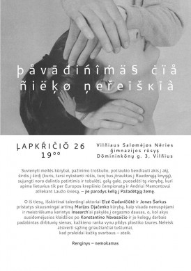 Niekada nedirbusių kartu skirtingų sričių menininkų grupė susivienys vienam kūrybinio vakaro nuotykiui. Rašytoja Marija Djačenko, teatro ir kino aktorė Elzė Gudavičiūtė, teatro aktorius ir muzikantas Jonas Šarkus, alternatyvaus džiazo grupė InSearch svečiuose pas skulptorių Konstantiną Navasaitį. Renginys vyks lapkričio 26 dieną (antradienį), Vilniaus Salomėjos Neries gimnazijos rūsyje, adresu Domininkonų gatvė 3, Vilnius.
