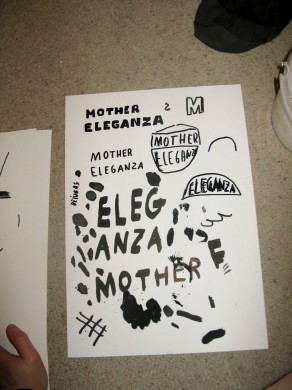 Paskui sekė eksperimentiniai-konceptual produktai, apranga, maikai – draftai, nepaMEnam… Gal labiau ranka traibinti, o gal maikiniai lipdukai su lygintuvu : ) ir Hand ŠilkPrintai. Atrodo, buvo trys pavadinimo idėjos: “Mother Eleganza”, “Kis Kis” ir kažkoks su 17(nepamenam). Nutarėm, kad su “Mother Eleganza” yra viskas taikliai pasakyta iki galo ir žaliai pradėjom biznį.