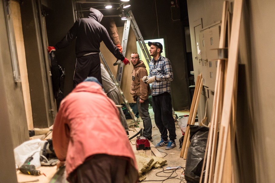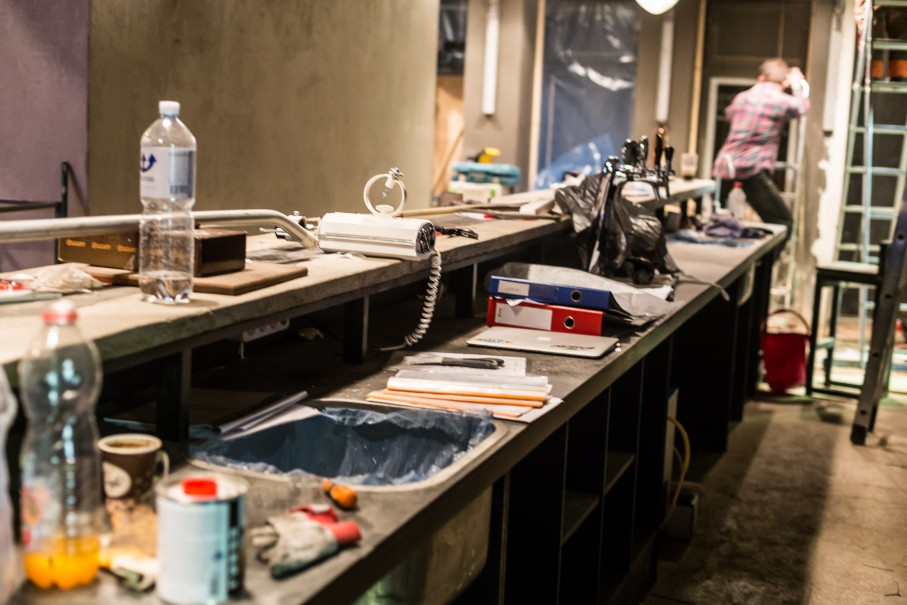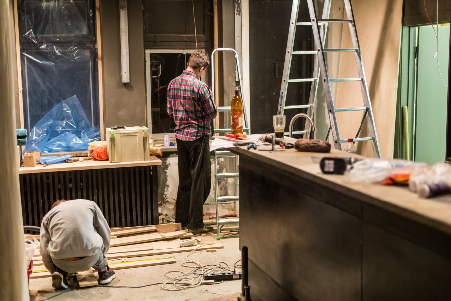 Ir tik šįryt išgriovėm sieną, padarėm pagrindinį įėjimą. Anksčiau čia buvo senas bufetas, kuris užsidarė apie 2004-uosius. Net radom gerą saują rublių, kurie buvo užkritę už apdailos. Sovietmečiu už tuos rublius buvo galima ledų visam kiemui nupirkti.