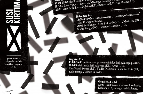 „Susikirtimai“ – tai garso meno ir eksperimentinės muzikos renginių ciklas, skirtas kultūra ir naujomis estetinėmis patirtimis besidominčiai auditorijai. Projektas supažindina klausytojus su garso menu, eksperimentine muzika ir patyrimine tarpdisciplinine kūryba. Specialiai šiam projektui buvo sukurta ir vasario 2 d. Kirtimų kultūros centre pristatyta keliaujanti garso ir šviesų instaliacija, vyko ją lydinčios paskaitos.